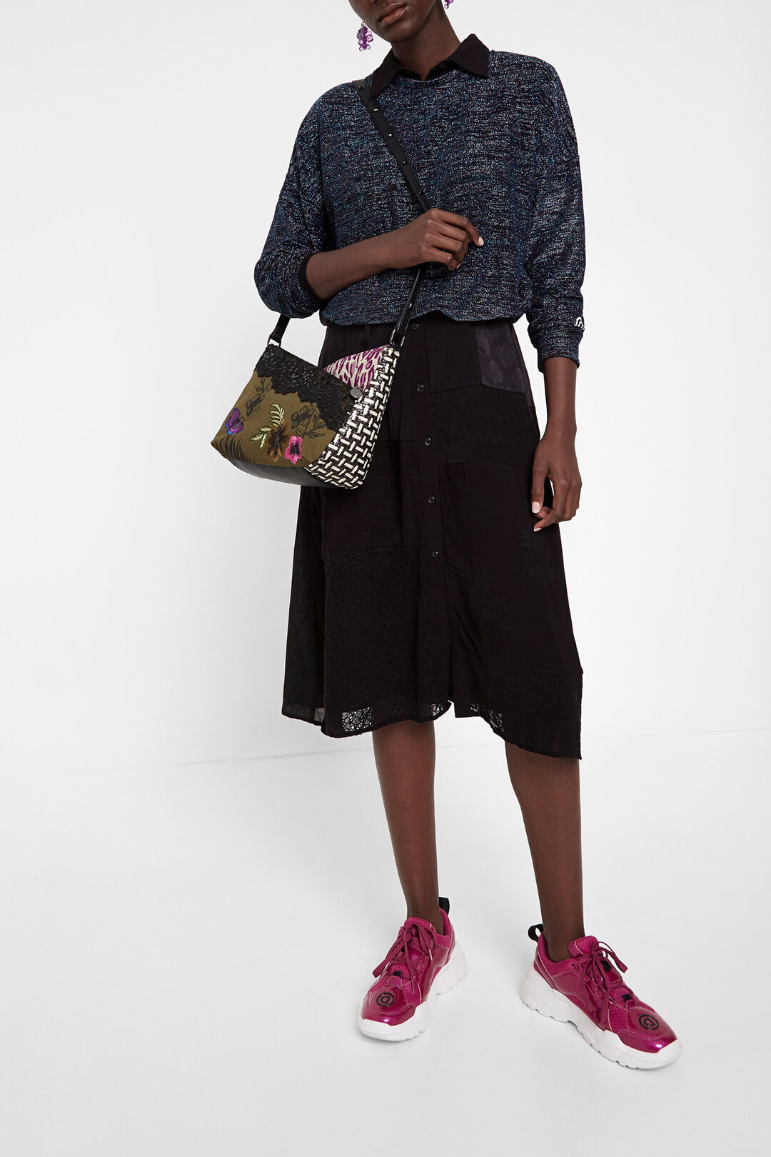 Este bolso bandolera Desigual Queen Miracle Harry Mini 20SAXA67 es una pieza de colección con un diseño que combina múltiples estampados: floral, animal print, étnico y marinero, en una mezcla atrevida, colorida y femenina. Un complemento funcional y exclusivo que ya no se encuentra en tiendas.