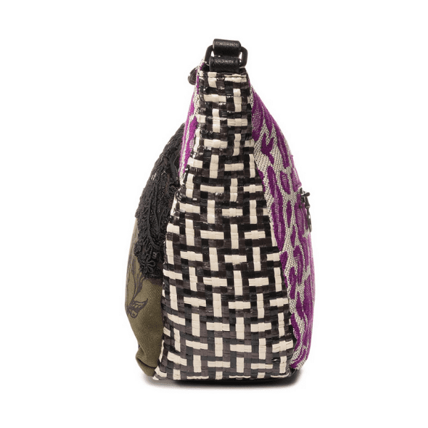 El bolso bandolera Desigual Queen Miracle Harry Mini 20SAXA67 es una pieza exclusiva de estilo único, ideal como regalo original para mujer o como complemento de diario con personalidad. Su diseño patchwork combina estampado animal print, floral, étnico y marinero, en una mezcla atrevida y femenina que resalta en cualquier look.