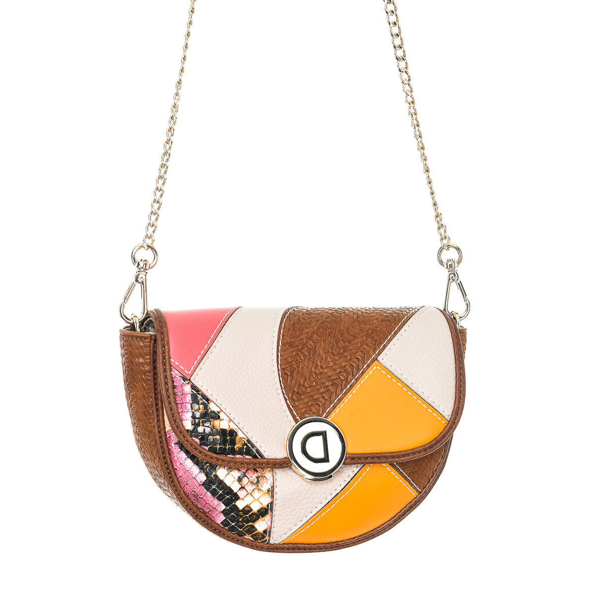 Hermosa Riñonera en forma de medialuna con un parche de texturas en tonos camel y marrón. Te resultara fácil de combinar con todos sus looks pues es cuestión de segundos puedes transformarlo en bolso simplemente añadiendo una cadena.