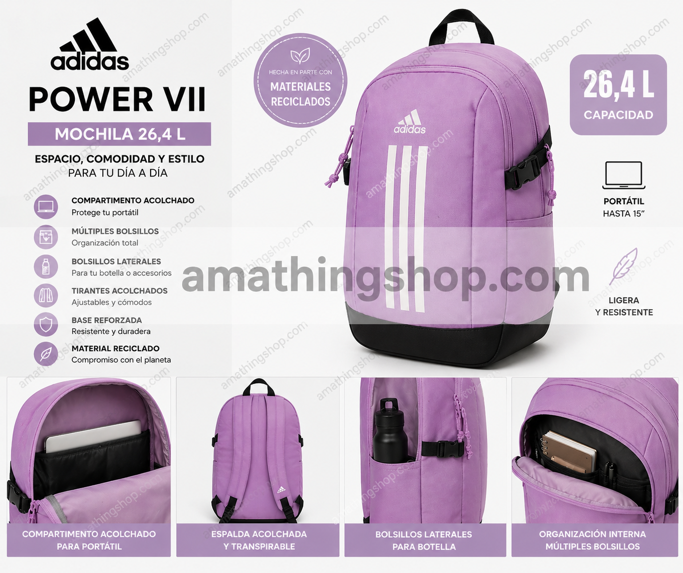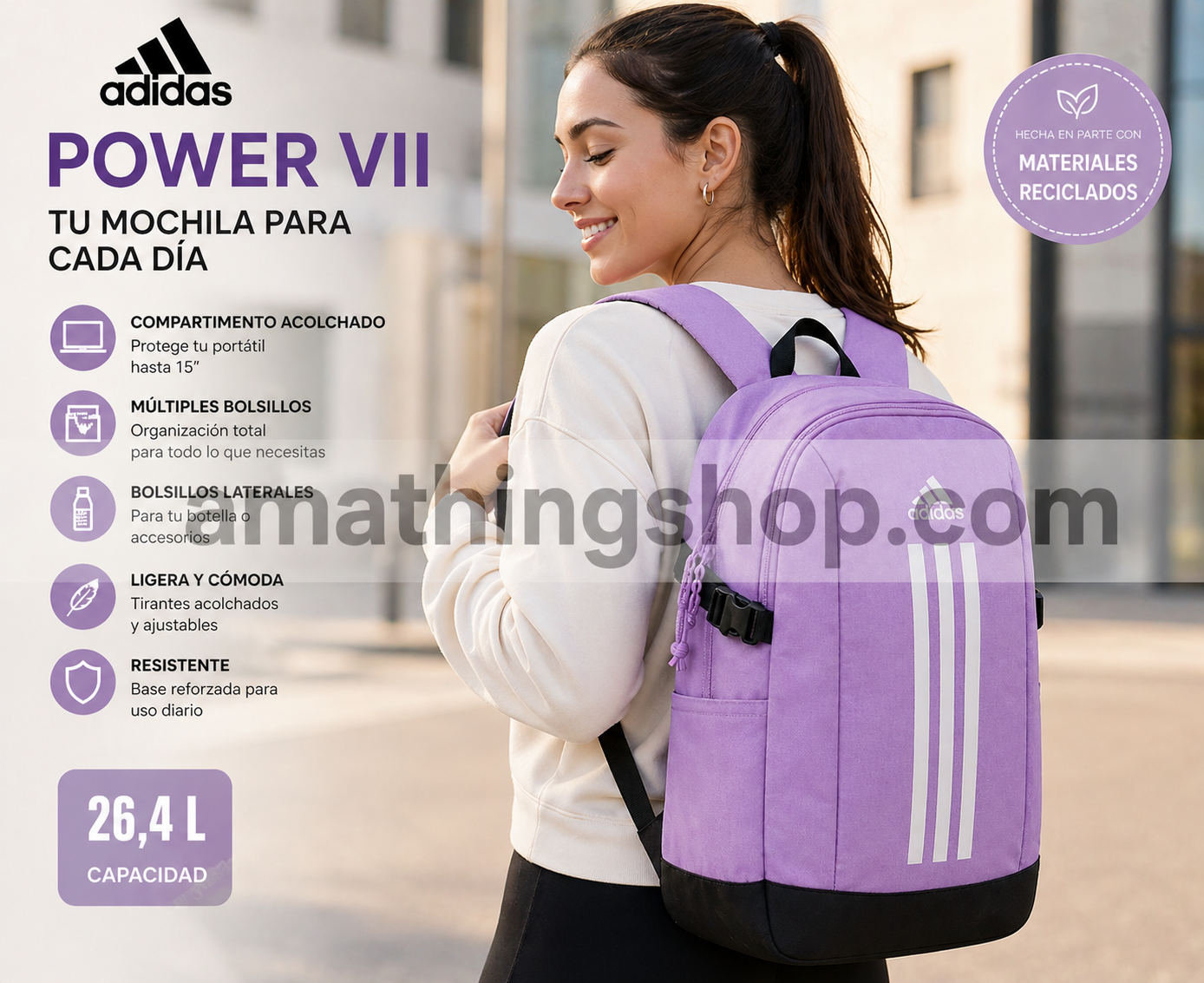 🎒 Si estás buscando una mochila Adidas mujer grande, cómoda y con espacio real para todo, este modelo Power VII en color lila suave es una de las mejores opciones para uso diario, trabajo o universidad.