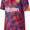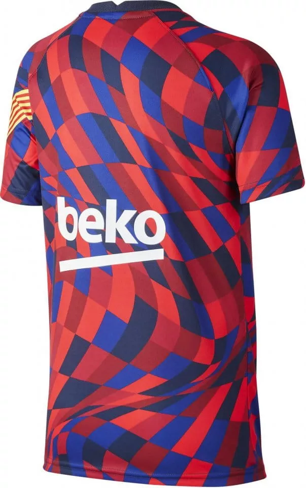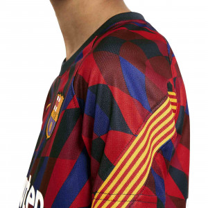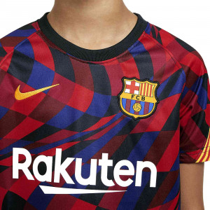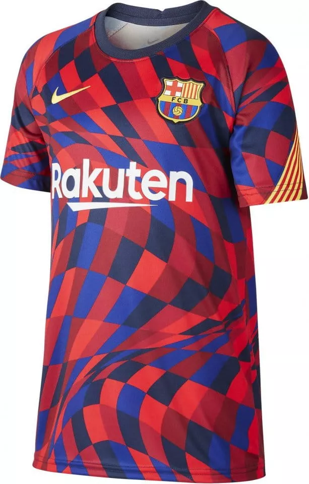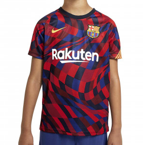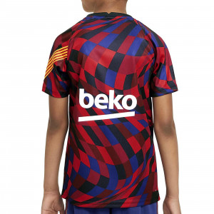 Camiseta oficial pre-partido del FC Barcelona 2020/2021 para niño. Diseño rojo-azul estilo mosaico, escudo bordado, Dri-FIT y detalles de la senyera. Última unidad disponible en talla S (128-137 cm).