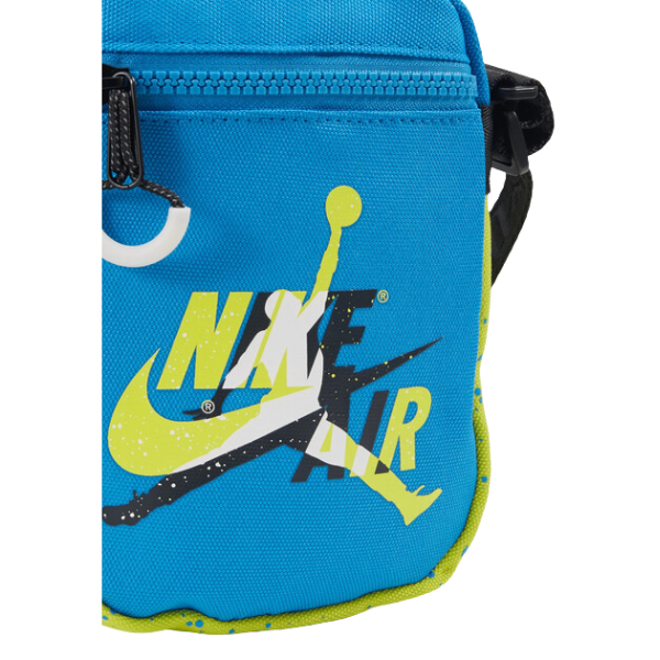 Bolso bandolera Nike Jordan Mashup Air azul y amarillo, modelo 9A0314-U6A. Edición limitada y descatalogada. Compacto, ligero y cómodo, ideal para llevar lo esencial. Unisex, perfecto para viajar, caminar, gimnasio o festivales. Medidas aproximadas: 19x13x3 cm.